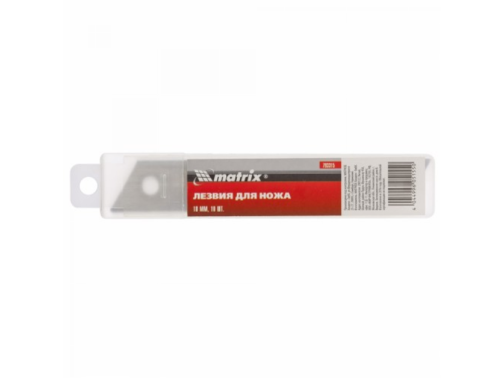 Набор со сменными лезвиям предназначен для оперативной замены вышедшего из строя основного лезвия ножа. Лезвия используются для разрезания плотной бумаги, пленки, картона, линолеума и т.д. Режущая кромка изготовлена из прочной высококачественной стали с равномерно острой заточкой по всей длине. На лезвие нанесены насечки, позволяющие при необходимости удалить затупившийся участок.Наборы лезвий совместимы с ножами торговых марок Matrix и Sparta согласно артикулам:Matrix — 78921, 78914, 78918, 78929;Sparta — 78973, 78974, 789195.